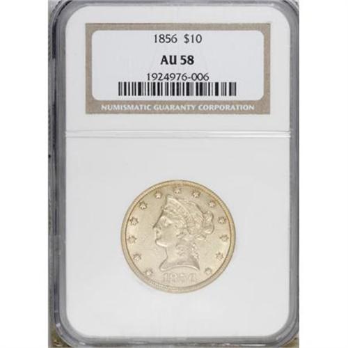 <B>1856 $10 AU58 NGC.</B></I> A wholly satisfying example, with rich antique-gold surfaces showing some deeper bronze color near the edges. Scattered abrasions are noted, but virtually no actual wear is seen. From a low mintage of just 60,490 pieces.<BR><BR><B>Coin Engraver:</B> Christian Gobrecht<BR><BR><b>Shipping:</b> Coins & Currency (<a target="_blank" href="http://www.heritageauctions.com/common/shipping.php">view shipping information</a>)
