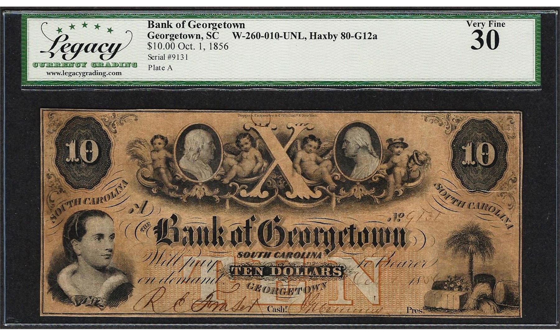 One 1856 $10 Bank of Georgetown South Carolina Obsolete Note Legacy Very Fine 30. Legacy Graded.
