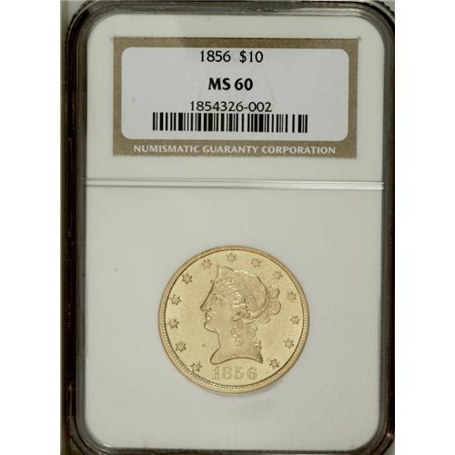 <B>1856 $10 MS60 NGC.</B></I> An impressive example of this conditionally rare No Motto issue. Smooth save for an obverse rim nick at 11 o'clock. The major devices are well struck, although the deeply hubbed stars are indistinct. Only 60,490 pieces were struck. Census: 10 in 60, 12 finer (10/06).<BR><BR><b>Shipping:</b> Coin/Currency (<a target="_blank" href="http://www.heritageauctions.com/common/shipping.php">view shipping information</a>)