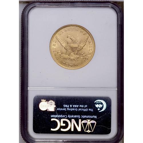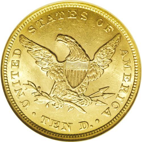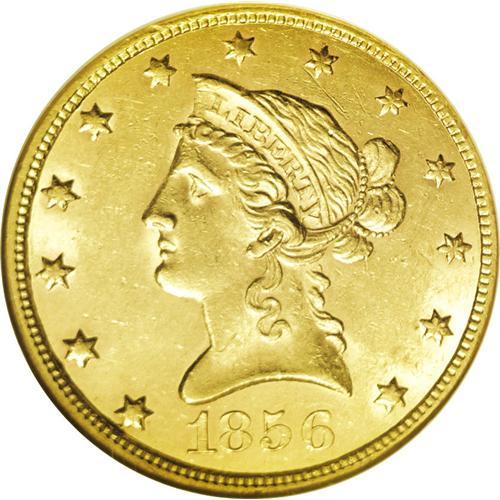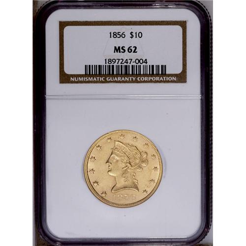 <B>1856<$10> MS62 NGC.</B></I> The 1856 eagle is very scarce in all grades, and most known examples are in XF or AU grades. To date, fewer than 40 coins have been certified as Mint State by NGC and PCGS. This MS62 specimen displays pretty apricot-gold color and just a few breaks in the otherwise nice luster, and the design features are sharply struck throughout. Several tiny contact marks and luster grazes are scattered over each side. Census: 2 in 62, 2 finer (3/06).