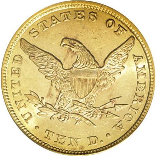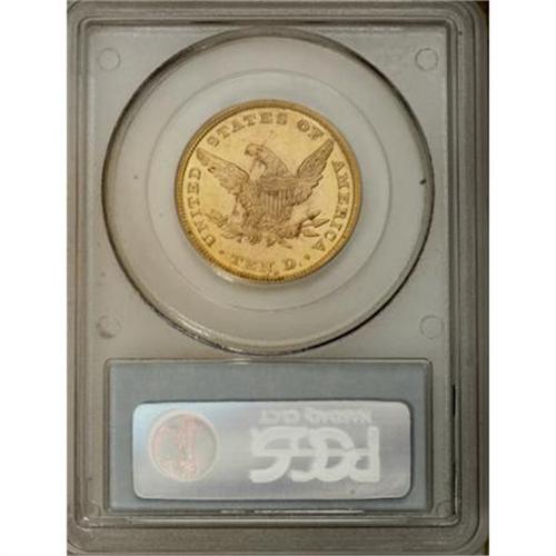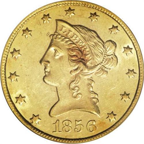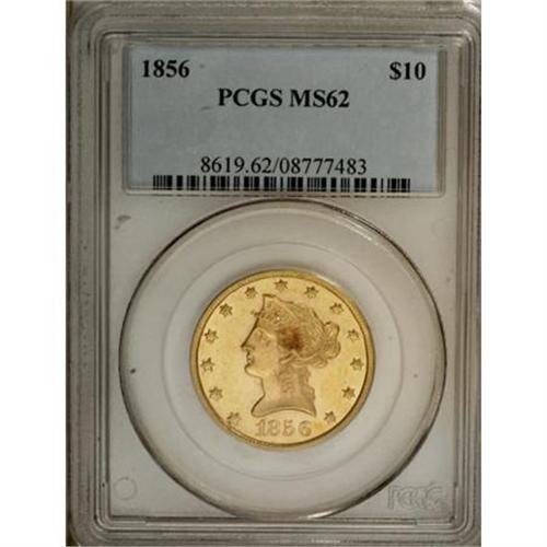 <B>1856 $10 MS62 PCGS.</B></I> Difficult to find in any grade, this issue is a genuine condition rarity in Mint State. This piece has a large spot of vivid magenta in the hair above Liberty's ear, nearly in the center of the lustrous yellow-gold obverse. Nicely struck with numerous minor abrasions in the fields. Population: 7 in 62, 7 finer (12/07).<BR><BR><B>Coin Engraver:</B> Christian Gobrecht<BR><BR><b>Shipping:</b> Coins & Currency (<a target="_blank" href="http://www.heritageauctions.com/common/shipping.php">view shipping information</a>)