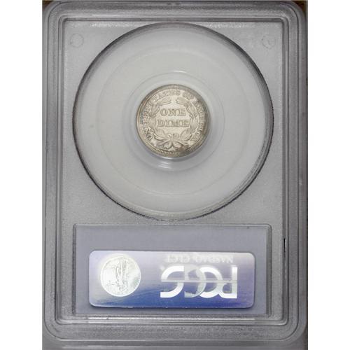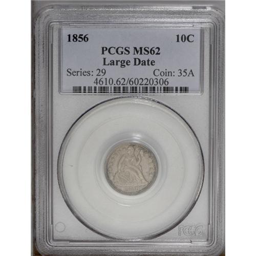 <B>1856<10C> Large Date MS62 PCGS.</B></I> Dusky lilac-gray color envelops the obverse, while the reverse is only lightly toned with peripheral olive and russet tints. Sharply struck save for some dentils, this conditionally rare Seated Dime is surprisingly unabraded. The luster is more vibrant on the reverse. Population: 3 in 62, 2 finer (3/06).