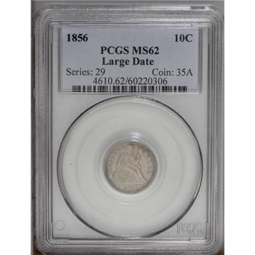 <B>1856 10C Large Date MS62 PCGS.</B></I> Dusky lilac-gray color envelops the obverse, while the reverse is only lightly toned with peripheral olive and russet tints. Sharply struck save for some dentils, this conditionally rare Seated Dime is surprisingly unabraded. The luster is more vibrant on the reverse. Population: 3 in 62, 2 finer (1/06).