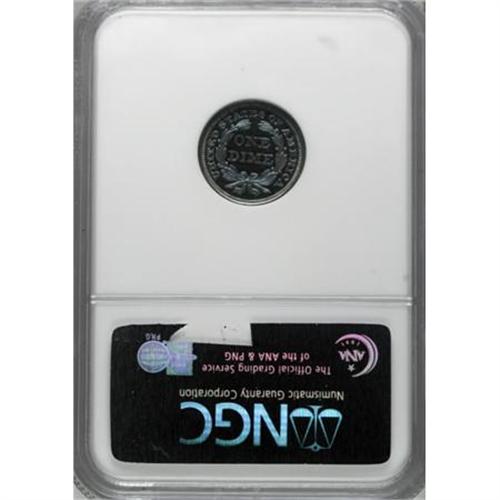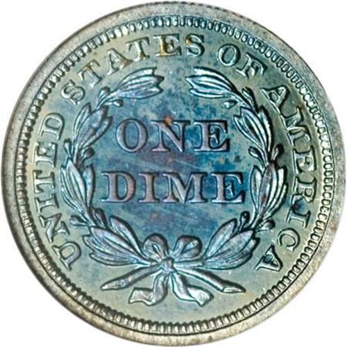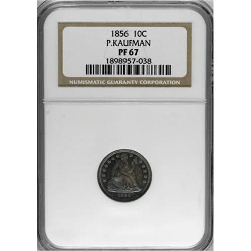 <B>1856 10C Small Date Dime PR67 NGC.</B></I> Ex: P. Kaufman. Perhaps as many as 100 proof 1856 dimes were coined with 35 to 50 survivors, almost all in low numerical grades or impaired. Unlike the majority, the Kaufman proof is a Superb Gem that is exceeded by just one coin certified by NGC.<BR> All known proof 1856 dimes have a small date with a slanting 5, although this logotype also exists on business strikes. The obverse die is doubled with the doubling plainest among the lower skirt details and at LIBERTY and the shield. It is believed that all 1856 proof dimes were coined from this obverse die, with examination of many or all survivors necessary for confirmation.<BR> Superb quality and extraordinary eye appeal are the hallmarks of this remarkable coin. The fields are deep with the mirrored surface shining brightly through vivid sea-green and magenta toning. The devices have full mint frost, an impeccable cameo proof, although not so designated. Census: 1 in 67, 1 finer (6/07).<I><BR>From The Phil Kaufman Collection of Early Proof Sets, Part One.</B></I> (#4745)<BR><BR><BR><B>Coin Engraver:</B> Christian Gobrecht<BR><BR><b>Shipping:</b> Coins & Currency (<a target="_blank" href="http://www.heritageauctions.com/common/shipping.php">view shipping information</a>\)