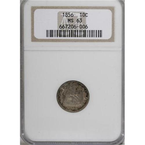<B>1856 10C Small Date MS63 NGC.</B></I> Pleasingly detailed with only faint, wispy abrasions that account for the grade. The softly lustrous surfaces offer lovely peach, rose, and silver-blue patina with a measure of deeper charcoal patina at the obverse margins. Census: 35 in 63, 54 finer (10/07).<BR><BR><B>Coin Engraver:</B> Christian Gobrecht<BR><BR><b>Shipping:</b> Coins & Currency (<a target="_blank" href="http://www.heritageauctions.com/common/shipping.php">view shipping information</a>)