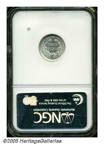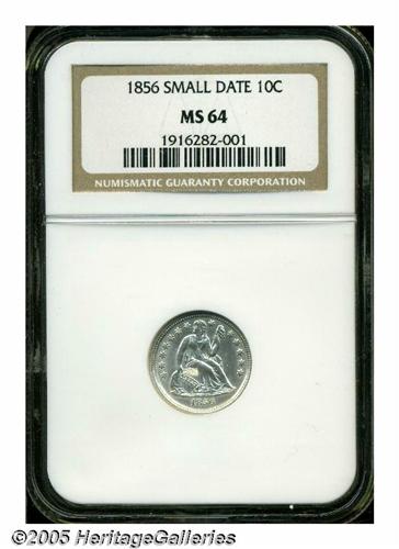 <B>1856<10C> Small Date MS64 NGC.</B></I> The more frequently encountered of the two date variants of 1856 dimes, this is a very pleasing example that has bright, essentially untoned surfaces. Just lacking a bit of highpoint definition, there are no obvious abrasions on either side.