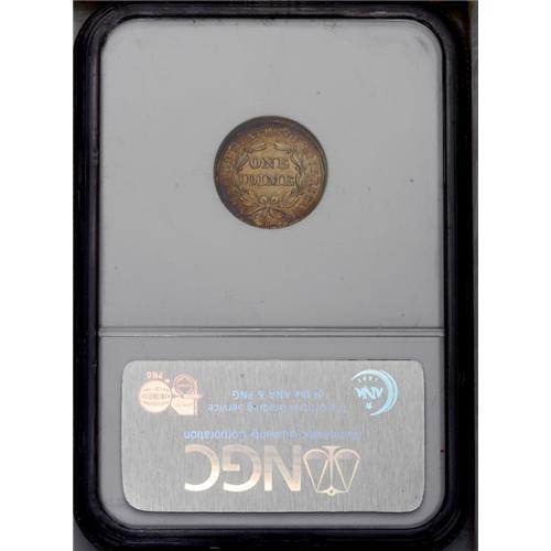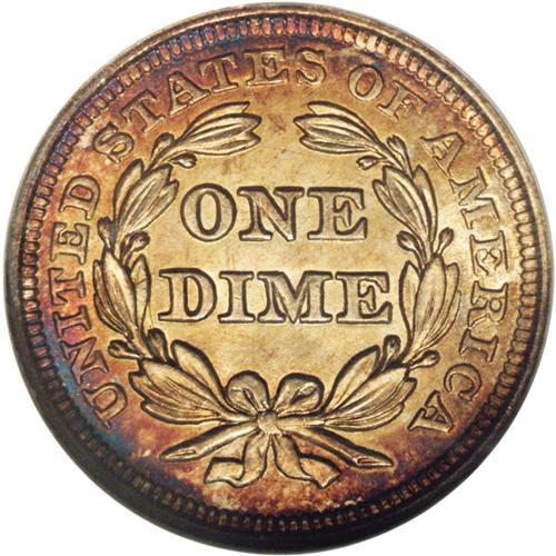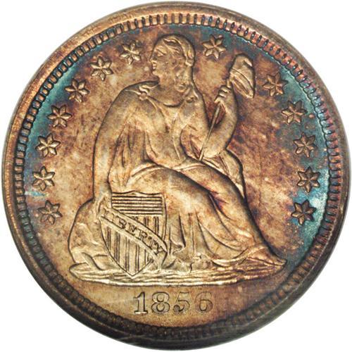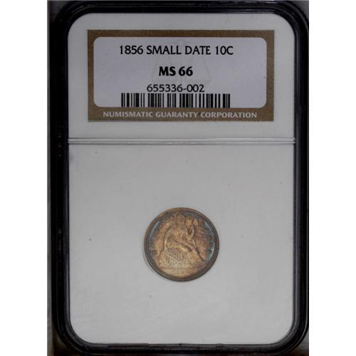 <B>1856<10C> Small Date MS66 NGC.</B></I> Richly toned in cascading layers of burnt-gold, red-russet, and cobalt-blue iridescence over the supremely lustrous surfaces. Sharply struck and carefully preserved, this shimmering Premium Gem is virtually distraction-free on both sides. The Small Date 1856 dime is by far the more frequently encountered of the two date variants from this year. Census: 8 in 66, 1 finer (3/06).