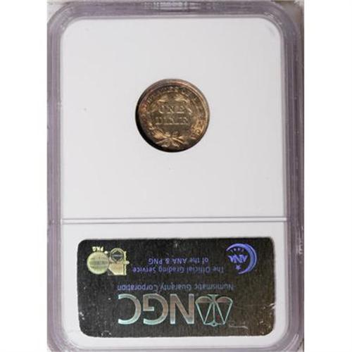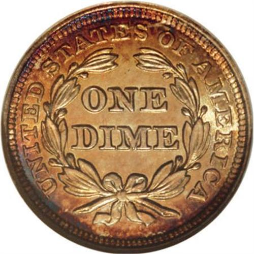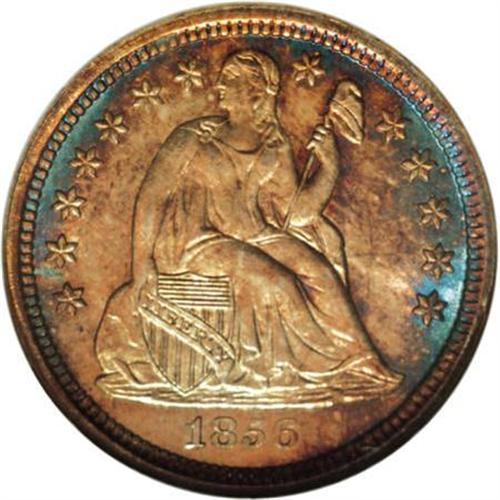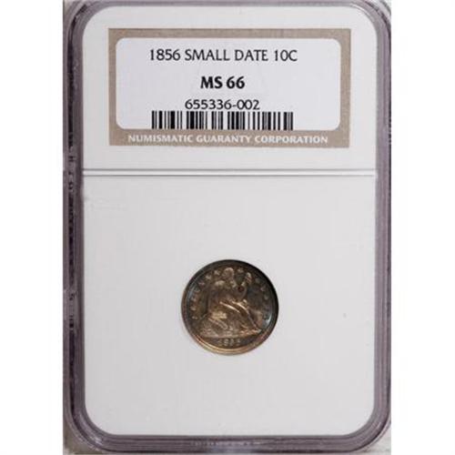 <B>1856 10C Small Date MS66 NGC.</B></I> Richly toned in cascading layers of burnt-gold, red-russet, and cobalt-blue iridescence over the shimmering surfaces. Sharply struck and impeccably preserved, this lovely Premium Gem is virtually distraction-free on both sides. Census: 7 in 66, 1 finer (6/07).<BR><BR><B>Coin Engraver:</B> Christian Gobrecht<BR><BR><b>Shipping:</b> Coins & Currency (<a target="_blank" href="http://www.heritageauctions.com/common/shipping.php">view shipping information</a>\)