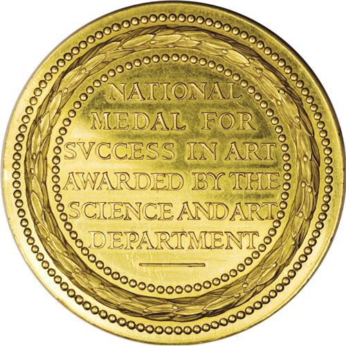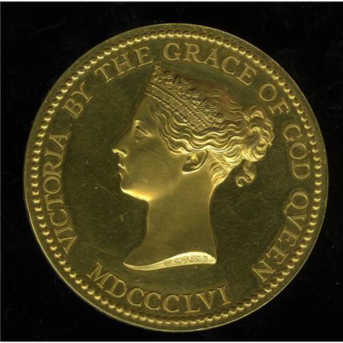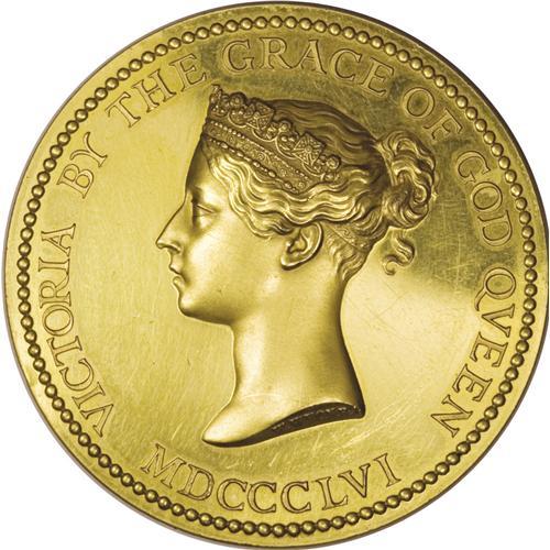 <B>1856 (1871) Great Britain, Department of Science and Art, Queen's Medal, AU50 Uncertified.</B></I> A 55-mm, 22-kt gold medal weighing 109.8 gm, or about 3.53 oz of gold. Moderate contact marks. The obverse of the medallion features the Young Head portrait of Queen Victoria. This medal was awarded to and inscribed William Butler. Nottingham. Stage 23 C. 1871 on the edge of the medal. The medallion was engraved by W. Wyon R.A. for the Science and Art Department. This outstanding example of 19th century engraving is accented by the high relief of the young bust of Queen Victoria. Large gold medals of this nature are seldom seen in today's marketplace. Because of the high bullion values of approximately 27 years ago, many large gold medals ended up in refiners' melting pots. We estimate the market value at roughly $2,500 to $3,000, and we would not be surprised to see this medal sell for an even more impressive price. Includes the original case of issue, even though it is a bit tattered.<BR><BR><b>Shipping:</b> Coin/Currency (<a target="_blank" href="http://www.heritageauctions.com/common/shipping.php">view shipping information</a>)