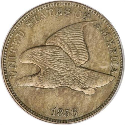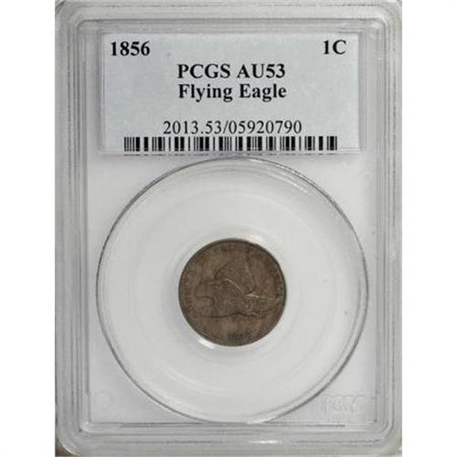 <B>1856 1C AU53 PCGS.</B></I> Snow-3. This variety is often pursued by knowledgeable collectors as the "Mint State" 1856 Flying Eagle cent. The diagnostic die scratches on each side are faint on this piece, but one has a good idea it might be an S-3 from the strike doubling seen on the date, a feature that is seen on a significant number of coins from this variety. From there, one can see the diagonal die scratch below the 1 in the date, which is common to all S-3 cents. <BR> Snow estimates that "probably no more than 700 pieces" were struck. Further, he states "it is nearly certain that this issue makes up most or all of the 634 specimens originally distributed to Congress to help promote passage of the pending coinage bill." These coins were struck as test pieces to try and anticipate what problems might occur with the new size, metal, and design. This example shows the production problem that did occur the following year: the head and tail feathers of the eagle are weakly struck as are many of the design elements on the reverse wreath. The surfaces have a honey-golden color overall with darker accents scattered irregularly on each side. <BR><BR><B>Coin Engraver:</B> James B. Longacre<BR><BR><b>Shipping:</b> Coins & Currency (<a target="_blank" href="http://www.heritageauctions.com/common/shipping.php">view shipping information</a>)