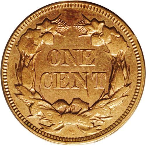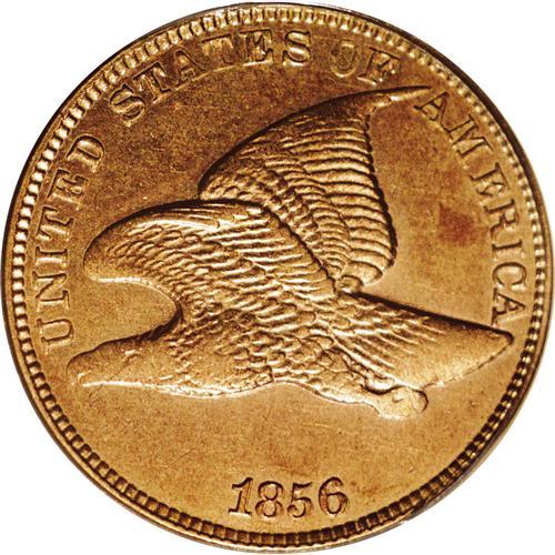 <B>1856<1C> AU55 ANACS.</B></I> Snow-3. The repunched 5 in the date and the level High Leaves reverse confirm the Snow-3 pairing. This bright and minutely granular example can be identified by a pair of thin, diagonal marks between the eagle and the date. The edges of the devices are blunt, typical for a Snow-3 business strike, and the date is lightly strike doubled east. Yellow-gold and salmon-pink tints emerge when the piece is rotated beneath a light. The 1856 Flying Eagle cent celebrates its sesquicentennial this year, and it remains one of the most famous rarities in American numismatics. Demand for examples continues to grow; partly due to greater awareness of the different die marriages, but primarily because key dates have been standout performers in the recent bull market for rare coins.