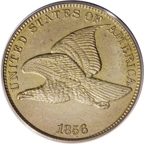<B>1856<1C> MS61 PCGS.</B></I> Snow-9. Although the characteristic die line from the top of I in UNITED is not visible on this example, it is a late die state with a die crack extending vertically downward from the eagle's beak. Today, it is believed that all examples of Snow-9 were struck as proofs, although there is no evidence of proof surface on this piece, and it has labeled a business strike by PCGS. The surfaces have a faintly granular light yellow appearance, and all design details are sharply defined. Traces of iridescent toning are visible on each side. The Snow-9 die combination was apparently a restrike, struck in the late 1850s or possibly the early 1860s.