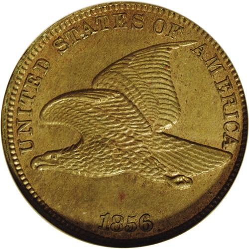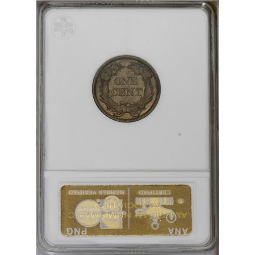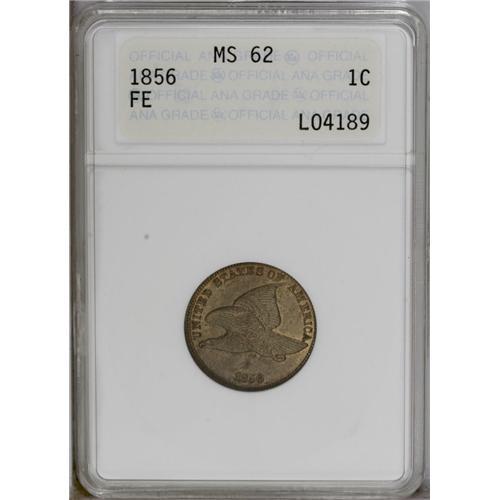 <B>1856<1C> MS62 ANACS.</B></I> Snow-9. The usual diagnostics for this variety are apparent: a thin die line (as made) above the I in UNITED, a die line on the wing below the I, a die polish line from the rim through the U in UNITED to the middle of the beak, and another extending downward from the beak's tip, a small die gouge (as produced) on the left ribbon end, and a small center dot is found below the upper left serif of the N in CENT. On page 37 of Rick Snow's reference on the Flying Eagle series, he states: "Most of the examples from this die pair which exist in high grade show detail and edges which confirm their status as proofs. However, the overall quality of these pieces are not anywhere near that of the regular proof issues of the period. These usually have dull or nonexistent mirrors....The probable reason for the poor quality is the relatively large production."<BR> While the fields on this piece are not "dull or nonexistent," they are somewhat shallowly mirrored, particularly in the areas clinging to the design elements on the right obverse and the lower reverse. A sharply executed strike is noted on the design elements, with no areas displaying weakness, another clue to the coin's proof origin. Each side reveals golden-tan color, and a couple of minute marks are seen on the reverse. The connoisseur of Flying Eagle cents will not want to miss out on this popular issue. <BR><BR><B>Important notice:</B> Heritage usually auctions material at the rate of 200-250 lots per hour. On some occasions eBay Live bid software or the Internet may not be able to keep up with the pace of the auction. We recommend placing a realistic absentee bid now as insurance to avoid disappointment. Occasionally the auctioneer may eliminate or reject an eBay Live bid, and the auctioneer may also reopen a lot after the close of the eBay live bidding (usually because we missed an audience bid), and may reject your bid even if it shows you as the winning bidder. By bidding via eBay Live, you agree that Heritage may award the lot to another bidder at its sole discretion under the circumstances described above or any other reasonable circumstances. Since eBay bids are not shown to us until we open the lot on the floor, we treat those bids just like floor bids. In most cases the floor responds before the eBay bid is presented to us, due to Internet lag time, so for consistency we have made it a policy that floor bids are always considered first over tie eBay live bids. Also please note that all Heritage lots purchased through eBay Live carry a 20% Buyer's Premium. Please make sure you read the Terms and Conditions before you bid. This lot is being auctioned in conjunction with a live floor auction by Heritage Galleries & Auctioneers. All final auction and invoice information will be supplied by Heritage Galleries & Auctioneers, and all other information should be considered preliminary. Lot:350 <BR><BR><B>Winning Notification and Billing:</B> After the FINAL session in this auction is complete, Heritage will send e-mail and snail mail invoices. This process normally takes several days. All final auction and invoice information will be supplied by Heritage Galleries & Auctioneers, and all other information should be considered preliminary. <BR><BR>This auction will be conducted on a live auction floor and over the Internet through eBay Live. If you choose to place an absentee bid, please take a moment to <font color='#0000ff'><u><a href='http://pages.ebay.com/liveauctions/help/before/laabsentee.html'>learn how eBay Live absentee bidding works</a></u></font><font color='#000000'>