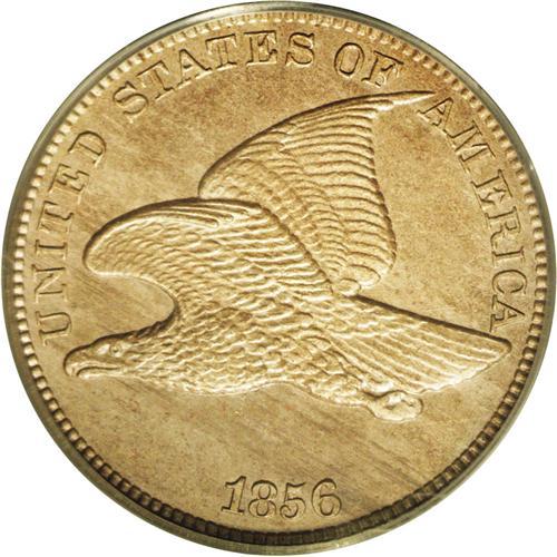 <B>1856 1C MS64 PCGS.</B></I> Snow-3. Die State C. This is one of the more common die pairings--if <I>common</B></I> can be used to describe an 1856 Flying Eagle cent. Free of the annoying spots and specks that often mar the surfaces, and attractive with semi-prooflike fields as are often encountered on this variety. The toning ranges from light tan to streaky-brown, particularly on the reverse. Identifiable by a minute planchet flaw near the eagle's chest above the 18. The strike is sharp on eagle except on the tips of his tail, and the reverse where the wreath shows ample definition on the lower portion, but minor softness on the veins of the cotton leaves. The copper-nickel alloy to make these new smaller style cents is 88% copper and 12% nickel. The nickel alloy gave the cents a lighter tan or even slightly white color scheme, and most of the business strikes are found with minor weakness on the highpoints.<BR> These new Flying Eagle cents were cause for celebration. The older style and still current Large cents were generally hated by the public as being too large, any quantity of them was cumbersome and often difficult to carry. Seizing this opportunity, entrepreneur Joseph Wharton used his extensive political clout to secure the proper legislation that authorized a new small cent, using--and get this--nickel. Yes, nickel, the bane of mints worldwide. Philadelphia Mint experiments confirmed that nickel is truly one of the hardest, least workable and difficult metals to turn into coinage, <I>but</B></I> this fact was not important to Congress, who with their collective stroke of a pen demanded nickel be used to alloy the new smaller copper-nickel cents. Wharton, who happened to own the largest group of nickel mines in the Western Hemisphere, finally had an outlet for his otherwise metallurgical curiosity. Once a steady flow of nickel was established to the Philadelphia Mint, Wharton set his eyes on other denominations, but that is another story.
