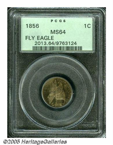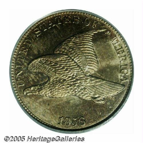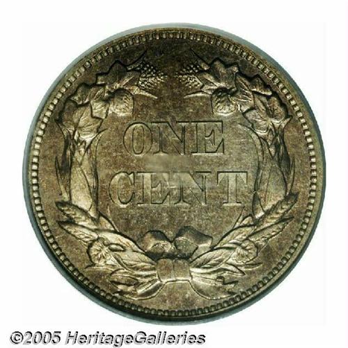 <B>1856<1C> MS64 PCGS.</B></I> Snow-9. There are the usual diagnostics for this variety: a thin die line (as made) above the I in UNITED and a small die scratch (as produced) on the left ribbon end, also a small center dot is found below the upper left serif of the N in CENT. Normally one associates this variety with proofs. While PCGS has determined this piece to be a business strike, we believe this coin may actually be a singly struck proof, as the eagle's tailfeathers lack complete definition. This variety was apparently struck in substantial numbers and many were released into circulation after the initial interest in them faded. The fields are mirror-like and the coin appears to us to be a proof in all regards other than incompleteness on the tailfeathers. Beautiful rose and lilac toning is splashed over each side of this impressive near-Gem example. Population: 34 in 64, 16 finer (3/05).