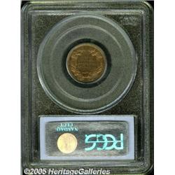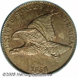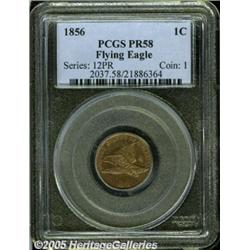 <B>1856 1C PR58 PCGS.</B></I> Snow-9. This is the most prevalent variety of the 1856 Flying Eagle Cent. Snow-9 is technically a restrike that, according to Rick Snow (2001), was produced starting in 1858. The striking period for this die marriage probably went through 1860, if not later. As these coins were prepared for distribution to collectors, there is a fairly high percentage of examples extant. A pleasing lightly circulated representative, this deeply toned coin is overlaid in tan hues with deep golden-orange accents. The strike is expectantly full for a proof. A couple of marks cite the pedigree of this example; a field scratch near the C and A of AMERICA, and a heavy abrasion above the C of CENT on the reverse. A very desirable example.