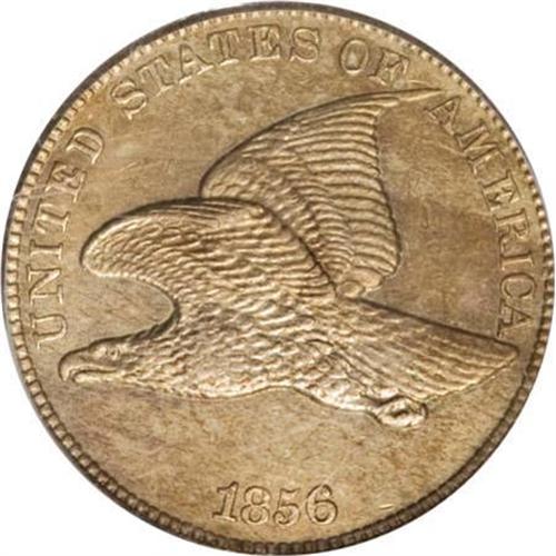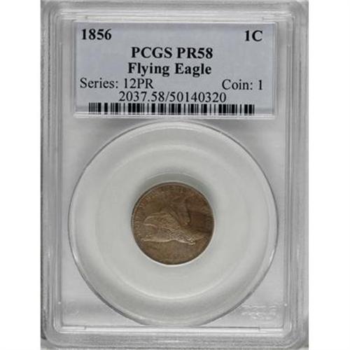 <B>1856 1C PR58 PCGS.</B></I> Snow-9. The die combination, as identified by Richard Snow, is a proof only variety. The obverse has a short die line from the right top of I in UNITED to the border, and the reverse has a bold center dot below the upper left serif of N in CENT.<BR> An impaired proof that has slight highpoint wear on each side. The surfaces are light tan with hints of darker rose toning. Both sides, especially the reverse, exhibit noticeable hairlines, indicating that it has been cleaned. Still a pleasing 1856 Flying Eagle cent with excellent luster and strong design elements.<BR><BR><B>Coin Engraver:</B> James B. Longacre<BR><BR><b>Shipping:</b> Coins & Currency (<a target="_blank" href="http://www.heritageauctions.com/common/shipping.php">view shipping information</a>)