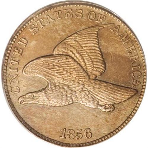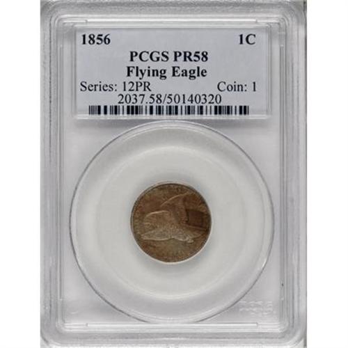 <B>1856 1C PR58 PCGS.</B></I> Snow-9. The die combination, as identified by Richard Snow, is a proof only variety. The obverse has a short die line from the right top of I in UNITED to the border, and the reverse has a bold center dot below the upper left serif of N in CENT.<BR> An impaired proof that has slight highpoint wear on each side. The surfaces are light tan with hints of darker rose toning, joined by whispers of blue-green on the obverse. Both sides, especially the reverse, exhibit fine hairlines. Still a pleasing 1856 Flying Eagle cent with strong design elements.<BR><BR><B>Coin Engraver:</B> James B. Longacre<BR><BR><b>Shipping:</b> Coins & Currency (<a target="_blank" href="http://www.heritageauctions.com/common/shipping.php">view shipping information</a>)