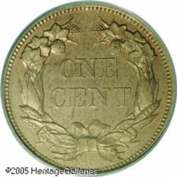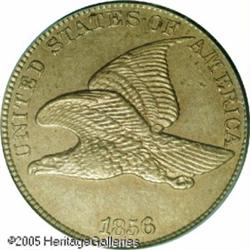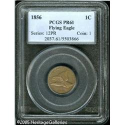 <B>1856 1C PR61 PCGS.</B></I> Snow-9. Rich orange-gold color dominates but occasionally cedes to lighter steel-blue hues. Scattered tiny freckles of gray patina are also present on this key date Cent. Well struck aside from a hint of softness on the center of the eagle's breast. Careful examination reveals a few tiny ticks, these certainly do not challenge the grade. Famous even in its day, the 1856 has great historical significance as the first Small Cent, and collected as such although technically it is also a pattern. Most proofs encountered are of the Snow-9 variety, which is promptly identified by the tiny die gouge (as made) within the left ribbon end and the horizontal die line (as produced) through the I in LIBERTY. Lot:5188
