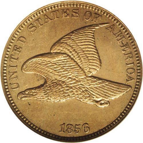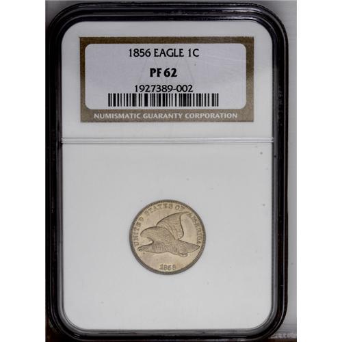 <B>1856 1C PR62 NGC.</B></I> Snow-3. The 5 in the date is recut, and the reverse die is the high leaf variety, with the small leaf extending well above the base of the C in CENT. Medium tan and reflective, with minimal hairlines for the grade. Identifiable by a minor planchet flake in the field below the eagle's head, and another between the ME of AMERICA. Minor weakness is found on the eagle's breast. One of the key dates to the series, with enough available to choose from, but these always bring a strong price. Many entered circulation at the time of issue, and soon replaced the unpopular Large Cents then current. No problem spots or specks to distract the eye, and this coin should make most collectors happy to finally complete their date collections.