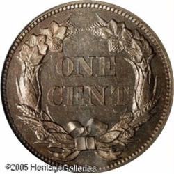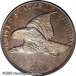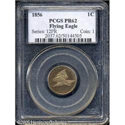 <B>1856 1C PR62 PCGS.</B></I> Snow-9. Most easily identified as a S-9 by the faint die scratch through the U in UNITED down to the eagle's beak. This variety is by far the most frequently encountered of the various 1856 Flying Eagle die marriages. It is believed that proofs from this die pairing were produced from late 1857 through 1860. This naturally colored amber and reddish-gold specimen has better-than-average reflective qualities for the issue. A few faint hairlines are seen on the reverse and there are a couple of minor disturbances on the opposite side, most notably below the eagle's tail. Desirable quality for this classic transitional issue. Lot:5189