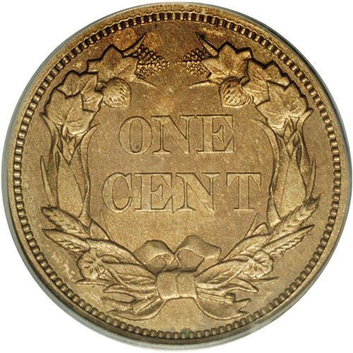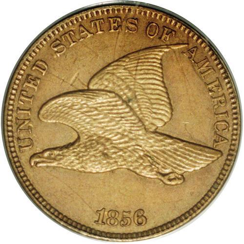 <B>1856<1C> PR62 PCGS.</B></I> Snow-9. The die scratch above the I in UNITED is plain, but the one in the wing is not, and the short scratch on the left ribbon end is also obvious. The surfaces are medium brown with some underlying pinkish-red visible on the obverse. Sharply struck throughout, the surfaces display a number of contact marks that account for the grade, most notably a pair above the eagle's forward wing, another above the tailfeathers, and there is a carbon spot on the reverse rim at 6 o'clock.