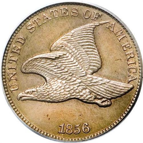 <B>1856 1C PR62 PCGS.</B></I> <B>Eagle Eye Photo Seal.</B></I> Snow-9, the usually seen proof dies, identified by the nearly imperceptible vertical die crack beneath the beak and a tiny die scratch (as made) on the left ribbon end. The opening of the O in OF is nearly square-shaped, as always on 1856 Flying Eagle cents, but unlike the vast majority of circulation strikes for the series. This needle-sharp and essentially mark-free specimen has even golden-tan toning aside from minor spots on the T in CENT and on the reverse rim at 3 o'clock. Careful rotation beneath a loupe locates a few faint hairlines on the obverse exergue, and these are all that deny a much finer grade.<BR><BR><B>Coin Engraver:</B> James B. Longacre<BR><BR><b>Shipping:</b> Coins & Currency (<a target="_blank" href="http://www.heritageauctions.com/common/shipping.php">view shipping information</a>)