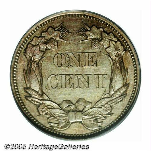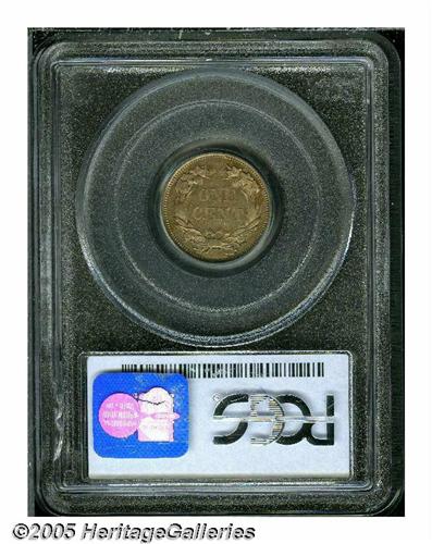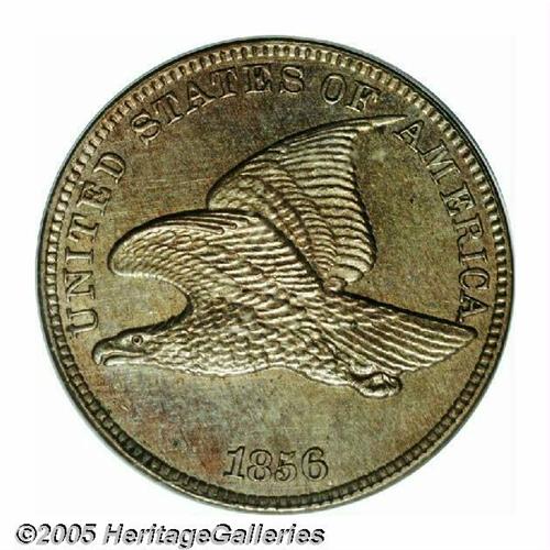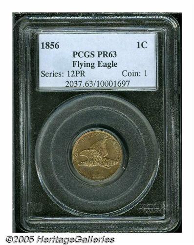 <B>1856<1C> PR63 PCGS.</B></I> Snow-9. A classic example of the S-9 variety with the die scratch extending clearly through the U in UNITED to the eagle's beak, the die crack at 11:30 on the reverse, and the tiny die gouge at the end of the left ribbon on the lower reverse. A fully struck specimen that reveals honey-gold, rose, and mauve colors when the piece is rotated under a light. A few wispy hairlines on the central reverse are appropriate for the grade. A historic issue made in limited quantities, the 1856 Flying Eagle cent launched the first coin collecting boom in the United States.