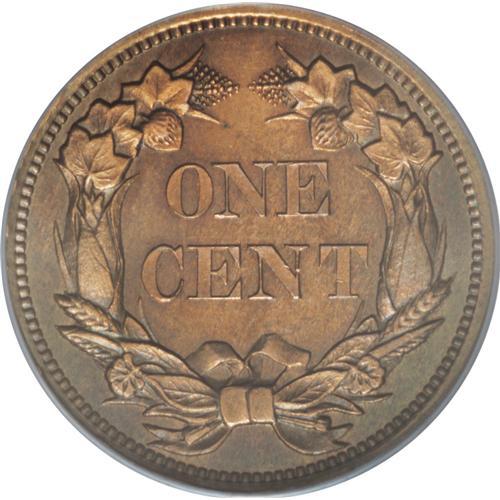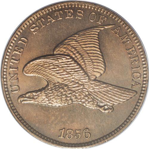<B>1856 1C PR63 PCGS.</B></I> Snow-9. This beautiful specimen has a razor-sharp strike and smooth, moderately mirrored fields. The rich apricot centers are framed by sea-green borders. All the Snow-9 diagnostics are present: a slender vertical die crack beneath the beak, a broken horizontal die line from the I in UNITED into the wing, and a diagonal die line through the U in UNITED. The reverse has the tiny die gouge from the edge of the left wreath stem. A splendid opportunity to secure a high quality example of this legendary issue, which ranks #23 in the 2003 edition of Jeff Garrett and Ron Guth's <I>100 Greatest U.S. Coins.</B></I><BR><BR><b>Shipping:</b> Coins & Currency (<a target="_blank" href="http://www.heritageauctions.com/common/shipping.php">view shipping information</a>)