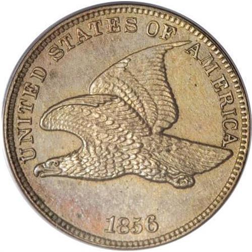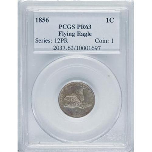 <B>1856 1C PR63 PCGS.</B></I> Snow-9. The present example shows high, squared rims and crisp striking detail throughout that confirm its status as a proof. Both business strikes and proofs are known from this die pair. Snow comments in <I>The Flying Eagle & Indian Cent Attribution Guide </B></I>that "the overall quality of these pieces is not anywhere near that of the regular proof issues of the period." Of course, this "period" was one in which the term "proof" was used much less strictly than today; high-grade business strikes were often called "proof." To further confuse the matter, some proofs are found in circulated condition. Although this die is not known to have been used after the original striking period, it is likely that some proof examples escaped into circulation around the Civil War.<BR> This die pairing, the most common for 1856 Flying Eagles, shows a small center dot under the left-top serif of the N in CENT, and on the obverse there is a prominent die polish line running from the rim above the I in UNITED that reappears on the front portion of the eagle's wing. This piece shows light golden-tan centers with orange-red margins. Considerable luster remains on each side (more so than typically seen), and a few small flecks of darker toning appear only under a loupe and are quite undistracting.<BR><BR><B>Coin Engraver:</B> James B. Longacre<BR><BR><b>Shipping:</b> Coins & Currency (<a target="_blank" href="http://www.heritageauctions.com/common/shipping.php">view shipping information</a>\)