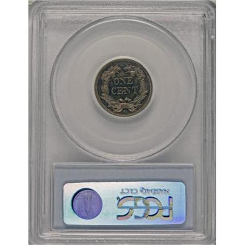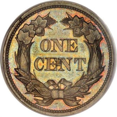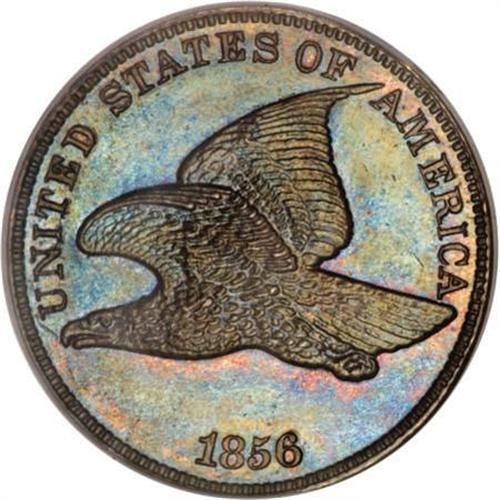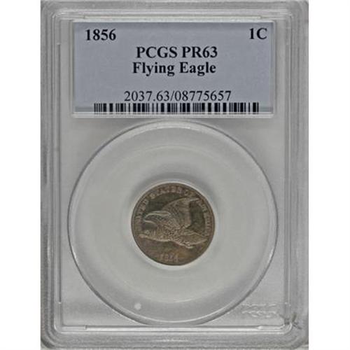 <B>1856 1C PR63 PCGS.</B></I> Snow-9. This variety, one of the 1856 Flying Eagle cent varieties that exists only in proof format, is identified by the small reverse die line on the left ribbon bow coupled with the obverse die lines above the I in UNITED and on the forward edge of the eagle's wing. Tinges of muted mint red appear around the device outlines, with iridescent olive, aqua, and tan coloration much evident elsewhere. A small gouge is noted between the eagle's head and the rim at 9 o'clock, and on the reverse a small planchet lamination is noted, as made, between EN in CENT. A nice midgrade proof example of this always in-demand issue. <BR><BR><B>Coin Engraver:</B> James B. Longacre<BR><BR><b>Shipping:</b> Coins & Currency (<a target="_blank" href="http://www.heritageauctions.com/common/shipping.php">view shipping information</a>)