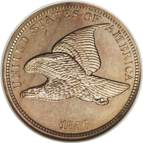 <B>1856<1C> PR64 Cameo NGC.</B></I> Snow-2. The U in UNITED has a pointed base, and faint die lines are present near the left ribbon end. Snow-2 is a much better die variety. In his 2001 <I>Flying Eagle & Indian Cent Attribution Guide, 1856-1858,</B></I> specialist Rick Snow estimates "about one out of every 30 to 40 examples" are Snow-2, and "between 15 and 25 examples exist." As of (9/06), NGC has certified exactly one 1856 Flying Eagle cent as Cameo. That would be the present coin, which does indeed display noticeable contrast between the devices and the mirrored field. The eagle is particularly frosty. Delightful orange, salmon-pink, and ice-white toning endows the flashy fields, which are nicely preserved but exhibit numerous faint mint-made striations. The dies are moderately rotated.