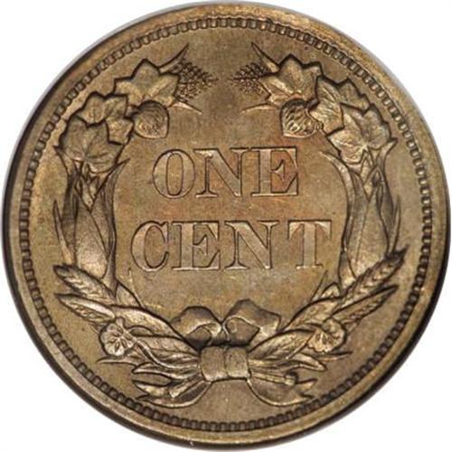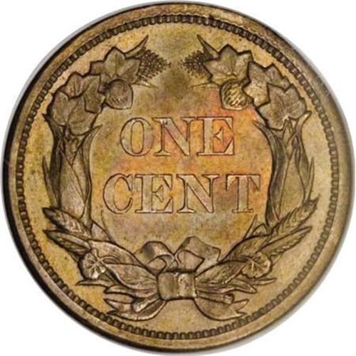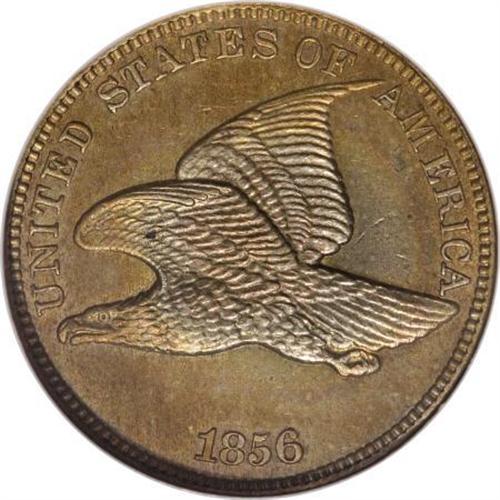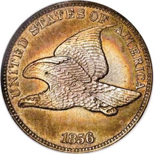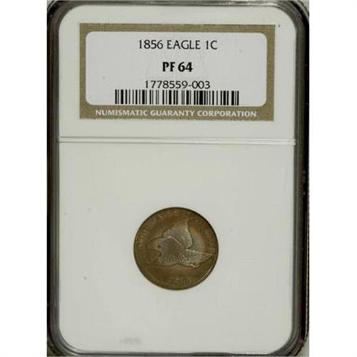 <B>1856 1C PR64 NGC.</B></I> Snow-9. The usual proof variety, identified by a tiny spike on the left ribbon end and a faint die line that lies parallel to the I in UNITED. This is an unusually attractive piece, because it displays multi-color bands of orange, forest-green, and gold. As expected of a proof striking, the features are razor-sharp, even on the eagle's extremities and the veins of the cotton leaves. This gently mirrored near-Gem is impressively devoid of marks, and would be the highlight of a Flying Eagle and Indian cent collection. As a date, the 1856 has the lowest mintage of any small cent, and since it introduced the denomination, its historical significance is assured.<BR><BR><b>Shipping:</b> Coins & Currency (<a target="_blank" href="http://www.heritageauctions.com/common/shipping.php">view shipping information</a>)