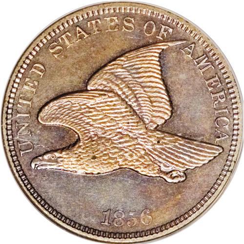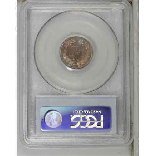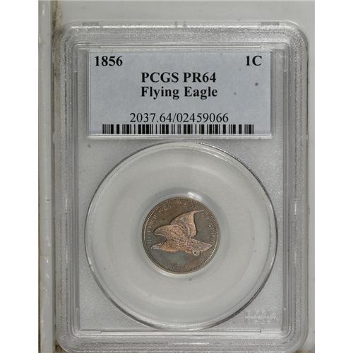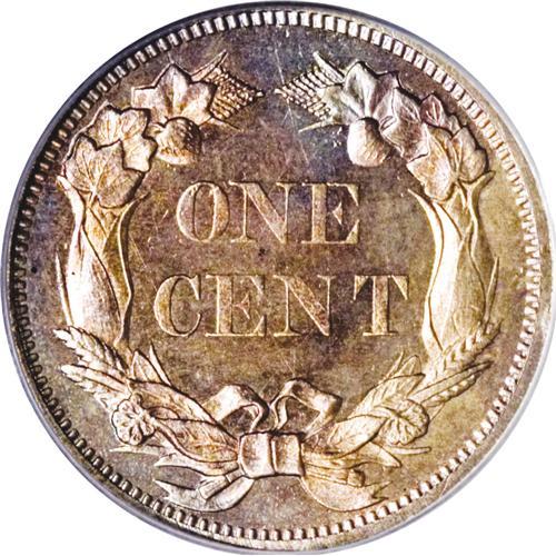 <B>1856 1C PR64 PCGS.</B></I> Snow-4. This scarce die pair shows a point at the bottom of the U in UNITED, and low leaves on the reverse. A small diagonal die line appears in the denticles below the right ribbon, on the lower reverse. Sharply struck and excellently preserved, this near-Gem displays reflective fields and attractive coral-red and steel-blue toning. Shallow mint-made lines, perhaps best described as roller marks, are noticeable across the central regions of the reverse. Neither hairlines nor contact marks are found on either side. The Snow-4 coins were probably struck in mid-1858, at the same time that the small letters proofs of that year were produced.<BR><BR><b>Shipping:</b> Coins & Currency (<a target="_blank" href="http://www.heritageauctions.com/common/shipping.php">view shipping information</a>)