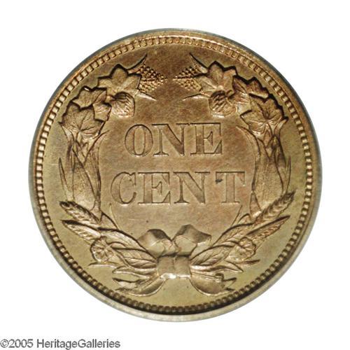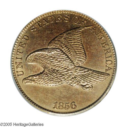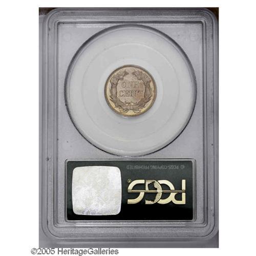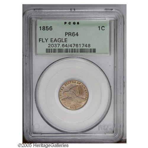<B>1856<1C> PR64 PCGS.</B></I> Snow-9. Subtly reflective with pinpoint striking details over the major design elements. Mottled orange and lilac overtones are noticed over both sides, but are far less obvious on the reverse. Most easily recognized as an S-9 by the faint die scratch through the U in UNITED down to the eagle's beak. This variety is by far the most frequently encountered of the various 1856 Flying Eagle die marriages. It is believed that proofs from this die pairing were produced from late 1857 through 1860. Desirable quality for this renowned premier small cent issue.