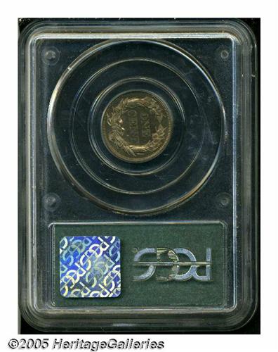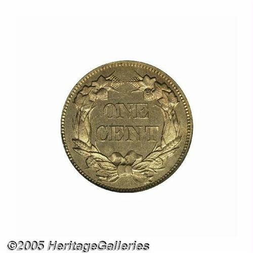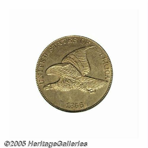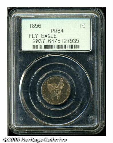 <B>1856<1C> PR64 PCGS.</B></I> Snow-9. This variety is the usually encountered one for proofs from this popular year. It is most easily attributed by the short die gouge from the left ribbon on the reverse, and a horizontal die line in the eagle's wing on the obverse. This variety constitutes the vast majority of 1856 Flying Eagle cents and was apparently struck over a long period of time from 1857 until sometime in the early 1860s, with sales finally dwindling after the beginning of the Civil War. These pieces were well made and are generally the best suited for type purposes of the 10 known varieties of 1856 cents. The fields on this coin are deeply reflective, uncommonly so for a copper-nickel product, with rich red and lilac patina over each side. Close examination shows a few small planchet flakes and contact marks on both obverse and reverse, which accounts for the less-than-Gem grade. A very attractive example of this first year of issue for small cents.