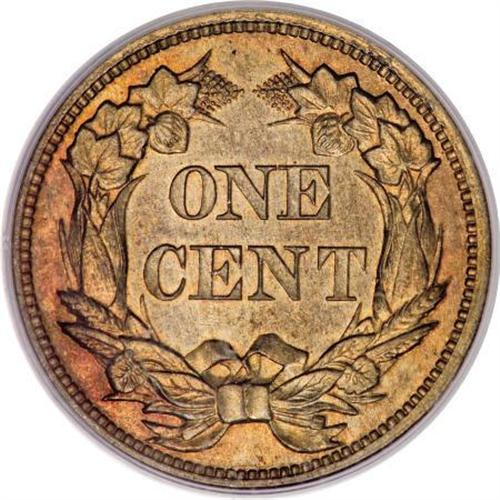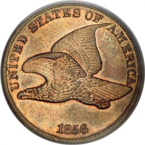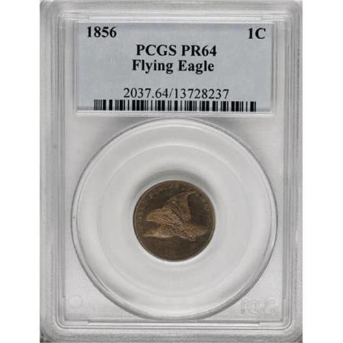 <B>1856 1C PR64 PCGS.</B></I> Snow-9. Fire-red adorns this pleasing key date cent, along with glimpses of orange and apple-green. The strike is unimprovably sharp, since the shading on the corn husks and the veins of the cotton leaves show complete detail. The denticles are sharply squared off, as expected of a proof striking. The flashy fields are nearly devoid of carbon and contact. A faint lamination beneath the upper wingtip provides an identifier for any future auction appearances. For the past 150 years, the 1856 Flying Eagle cent has been considered the stepping stone to an advanced collection of U.S. coinage.<BR><I>From The Madison Collection.</B></I><BR><BR><B>Coin Engraver:</B> James B. Longacre<BR><BR><b>Shipping:</b> Coins & Currency (<a target="_blank" href="http://www.heritageauctions.com/common/shipping.php">view shipping information</a>)