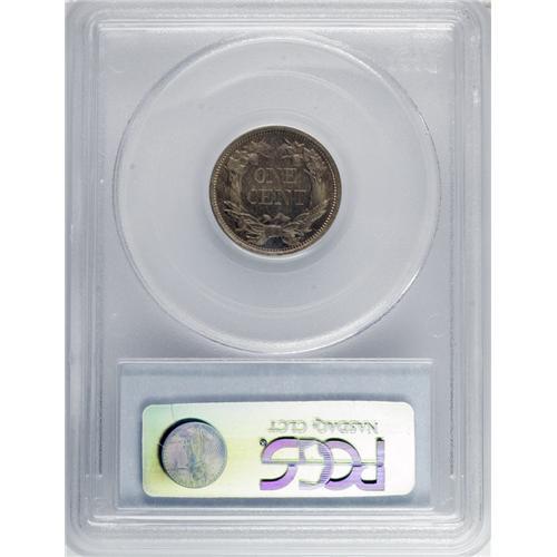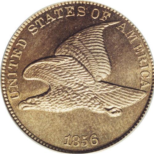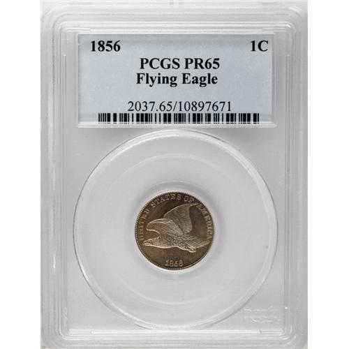 <B>1856 1C PR65 PCGS.</B></I> Snow-9. A beautiful Gem of this American numismatic classic. The strike is pinpoint-sharp, and there is no indication of the strike doubling that sometimes affects this date. Orange hues grace protected areas, while the open fields exhibit olive and rose tints. The obverse features splendid cartwheel luster, and the field shows little reflectivity. In contrast, the reverse is noticeably reflective, but also exhibits satin luster. Both sides are unabraded, and the conservatively assessed grade is determined solely by completely unimportant carbon traces. The advent of collecting 1856 Flying Eagle cents by die variety has shifted specialist interest toward rare marriages, but there is no doubt that nearly all of the most attractive pieces, such as the present coin, are from the Snow-9 pairing.<BR><BR><b>Shipping:</b> Coin/Currency (<a target="_blank" href="http://www.heritageauctions.com/common/shipping.php">view shipping information</a>)