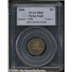 <B>1856<1C> PR65 PCGS.</B></I> Snow-9. The S-9 variety is the most frequently encountered die pairing for 1856 Flying Eagle Cents. These coins were produced from late 1857 until 1860. A considerable (but unknown) number were struck and apparently stockpiled in the mint for sale to collectors. Snow speculates that after the start of the Civil War, sales stagnated, and those pieces that remained were mistakenly released into circulation. This is a fully original example that has lustrous surfaces that display variegated golden, brown, and lilac coloration with the reverse being somewhat deeper in hue. A pleasing, high grade example of this fabled 19th century rarity. Population: 40 in 65, 5 finer (3/04). <BR><BR><B>Important notice:</B> Heritage usually auctions material at the rate of 200-250 lots per hour. On some occasions eBay Live bid software or the Internet may not be able to keep up with the pace of the auction. We recommend placing a realistic absentee bid now as insurance to avoid disappointment. Occasionally the auctioneer may eliminate or reject an eBay Live bid, and the auctioneer may also reopen a lot after the close of the eBay live bidding (usually because we missed an audience bid), and may reject your bid even if it shows you as the winning bidder. By bidding via eBay Live, you agree that Heritage may award the lot to another bidder at its sole discretion under the circumstances described above or any other reasonable circumstances. Since eBay bids are not shown to us until we open the lot on the floor, we treat those bids just like floor bids. In most cases the floor responds before the eBay bid is presented to us, due to Internet lag time, so for consistency we have made it a policy that floor bids are always considered first over tie eBay live bids. Also please note that all Heritage lots purchased through eBay Live carry a 20% Buyer's Premium. Please make sure you read the Terms and Conditions before you bid.