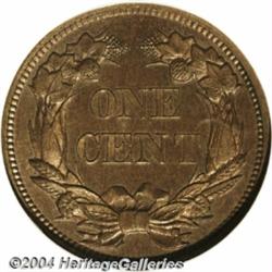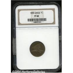 <B>1856<1C> PR66 NGC.</B></I> Snow-9. The most frequently encountered of the several varieties of 1856 Flying Eagle Cents, the original mintage may have been as high as 2,000 pieces with an estimated 300 coins extant today in various grades. The fields are deeply reflective, but this effect is not immediately apparent as each side is quite heavily toned. Deep gray-brown patina covers most of the surfaces with small areas of bright mint luster still evident around the outer devices. An original and impeccably preserved example of this key issue, and certainly one of the finest known. Population: 2 in 66, 1 finer (7/04). <BR><BR><B>Important notice:</B> Heritage usually auctions material at the rate of 200-250 lots per hour. On some occasions eBay Live bid software or the Internet may not be able to keep up with the pace of the auction. We recommend placing a realistic absentee bid now as insurance to avoid disappointment. Occasionally the auctioneer may eliminate or reject an eBay Live bid, and the auctioneer may also reopen a lot after the close of the eBay live bidding (usually because we missed an audience bid), and may reject your bid even if it shows you as the winning bidder. By bidding via eBay Live, you agree that Heritage may award the lot to another bidder at its sole discretion under the circumstances described above or any other reasonable circumstances. Since eBay bids are not shown to us until we open the lot on the floor, we treat those bids just like floor bids. In most cases the floor responds before the eBay bid is presented to us, due to Internet lag time, so for consistency we have made it a policy that floor bids are always considered first over tie eBay live bids. Also please note that all Heritage lots purchased through eBay Live carry a 20% Buyer's Premium. Please make sure you read the Terms and Conditions before you bid. </span></font></tr></table></td></tr></table>