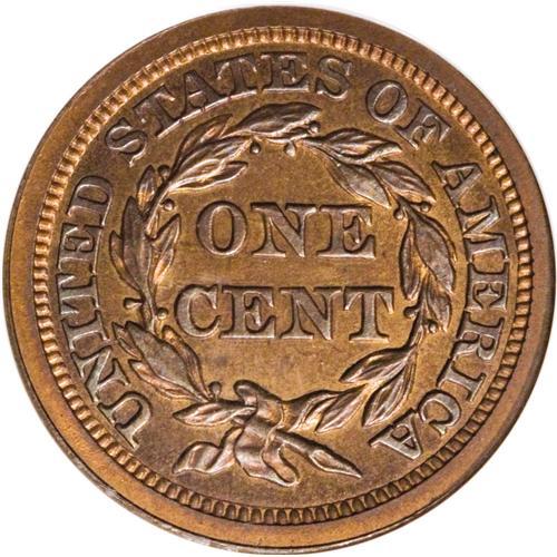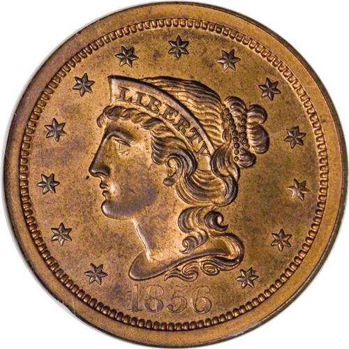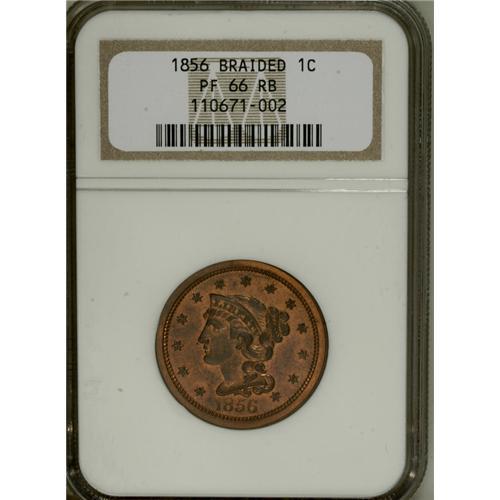 <B>1856 1C PR66 Red and Brown NGC.</B></I> N-5, Low R.5. A proof-only Newcomb variety that displays the following diagnostics: an italic 56 in the date, a die line from the right serif of the upper crossbar in the T of LIBERTY to the lower left base of Y, three more die lines on the neck just below the earlobe, defects in the E of ONE at its right top and under the serif of the crossbar (possibly the remnants of another letter), and a lump on the right base of the N in UNITED.<BR> Original orange mint luster dominates both sides of this Premium Gem Red and Brown proof, joined by whispers of crimson and lilac in the fields and tan-blue patina on the devices. Broad, squared off borders give way to razor-sharp dentilation, and a powerful strike has imparted bold delineation to the design elements. Liberty's hair, the star centrils, and the leaf ribbing are crisp, as befits a proof. Close inspection reveals no mentionable contact marks or unsightly spotting on the well preserved surfaces. EAC PR63. Census: 1 in 66 Red and Brown, 0 finer (4/07).<BR><BR><b>Shipping:</b> Coins & Currency (<a target="_blank" href="http://www.heritageauctions.com/common/shipping.php">view shipping information</a>)