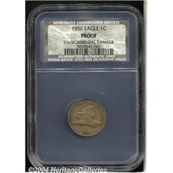 <B>1856<1C> Proof, Environmental Damage, NCS.</B></I> Snow-2a. High Leaves, Open E in ONE. The 1 in the date is centered between denticles, and the ball of the 5 is over the right side of a denticle. Brief circulation and moderate granularity combine to remove the die diagnostics, but S-2 is the only remaining candidate after other varieties are eliminated. Rick Snow estimates there are 15 to 25 examples of this marriage. A chestnut-gray piece with unabraded surfaces and reasonable eye appeal.<BR><I>From The Paulsboro Collection, Part Three.</B></I> <BR><BR><B>Important notice:</B> Heritage usually auctions material at the rate of 200-250 lots per hour. On some occasions eBay Live bid software or the Internet may not be able to keep up with the pace of the auction. We recommend placing a realistic absentee bid now as insurance to avoid disappointment. Occasionally the auctioneer may eliminate or reject an eBay Live bid, and the auctioneer may also reopen a lot after the close of the eBay live bidding (usually because we missed an audience bid), and may reject your bid even if it shows you as the winning bidder. By bidding via eBay Live, you agree that Heritage may award the lot to another bidder at its sole discretion under the circumstances described above or any other reasonable circumstances. Since eBay bids are not shown to us until we open the lot on the floor, we treat those bids just like floor bids. In most cases the floor responds before the eBay bid is presented to us, due to Internet lag time, so for consistency we have made it a policy that floor bids are always considered first over tie eBay live bids. Also please note that all Heritage lots purchased through eBay Live carry a 20% Buyer's Premium. Please make sure you read the Terms and Conditions before you bid. </span></font></tr></table></td></tr></table>