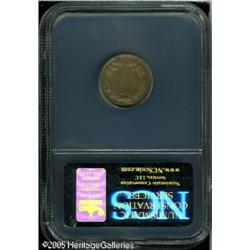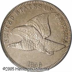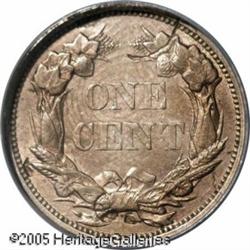 <B>1856 1C Proof, Reverse Damage, NCS.</B></I> Snow-9. A sharply struck golden-brown piece that has no actual wear, but the reverse exhibits a hint of verdigris at 11 o'clock and a minor scrape affects the wreath ribbon. The reverse has several interesting impressions, most of these appear to be mint-made strike-thrus, although a small shrimp-shaped impression left of the wreath ribbon does resemble damage. Personal evaluation of this piece is recommended. Lot:5187