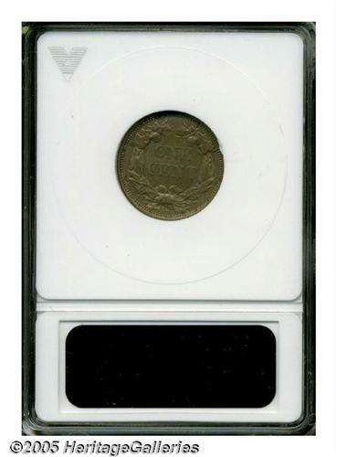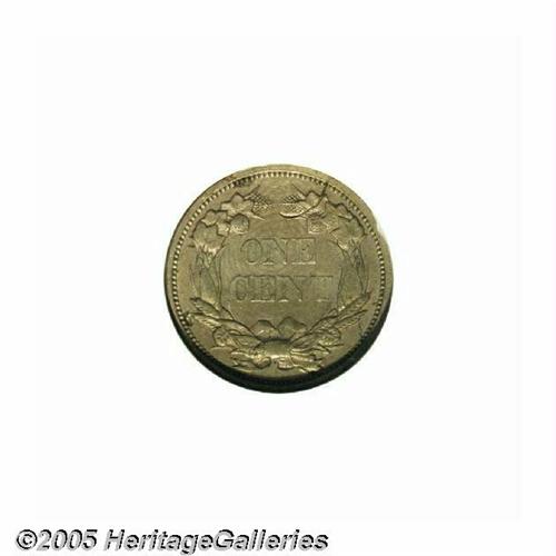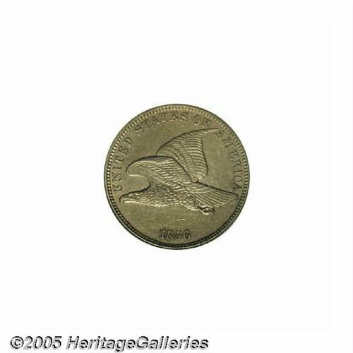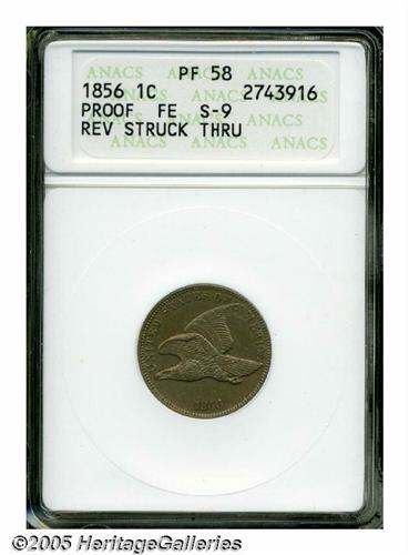 <B>1856<1C>--Reverse Struck Thru--PR58 ANACS.</B></I> Snow-9. A bold golden-brown example of this famous and important issue. Moderate abrasions are noted on the 'knot' of the wreath bow, and the obverse has small marks at the center and on the field above the tail feathers. The reverse has several interesting peripheral impressions, all are incuse with smooth edges, and are presumably mint-made strike-thrus. The most dramatic among these is a thick wire-shaped strike-through at 1 o'clock, and a shrimp-shaped impression left of the wreath bow.