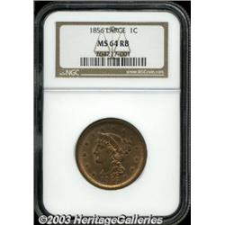 1856 1C Slanted 5 MS64 Red and Brown NGC. N-14, R.1. Tiny die lines (as made) from Liberty's earlobe confirm the Newcomb variety. Bright gold color outlines the legends and devices, while the fields and portrait offer light lilac patina. The obverse is splendidly preserved, and the reverse is also clean aside from a few tiny ticks on the lower rim. Important notice: Heritage usually auctions material at the rate of 200-250 lots per hour. On some occasions eBay Live bid software or the Internet may not be able to keep up with the pace of the auction. We recommend placing a realistic absentee bid now as insurance to avoid disappointment. Occasionally the auctioneer may eliminate or reject an eBay Live bid, and the auctioneer may also reopen a lot after the close of the eBay live bidding (usually because we missed an audience bid), and may reject your bid even if it shows you as the winning bidder. By bidding via eBay Live, you agree that Heritage may award the lot to another bidder at its sole discretion under the circumstances described above or any other reasonable circumstances. Also please note that all Heritage lots purchased through eBay Live carry a 20% Buyer's Premium. Please make sure you read the Terms and Conditions before you bid.