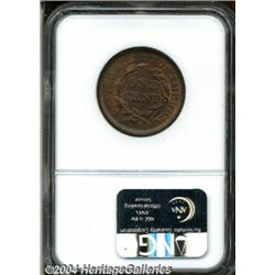 <B>1856<1C> Slanted 5 MS64 Red and Brown NGC.</B></I> N-2, R.1. Die State D. Bright gold color occasionally cedes to lavender hues. Undisturbed aside from a small mark in the field near the chin. A couple of minor planchet flaws (as made) are found inside the wreath. The major devices are well struck, although the upper stars are not fully brought up by the dies. <BR><BR><B>Important notice:</B> Heritage usually auctions material at the rate of 200-250 lots per hour. On some occasions eBay Live bid software or the Internet may not be able to keep up with the pace of the auction. We recommend placing a realistic absentee bid now as insurance to avoid disappointment. Occasionally the auctioneer may eliminate or reject an eBay Live bid, and the auctioneer may also reopen a lot after the close of the eBay live bidding (usually because we missed an audience bid), and may reject your bid even if it shows you as the winning bidder. By bidding via eBay Live, you agree that Heritage may award the lot to another bidder at its sole discretion under the circumstances described above or any other reasonable circumstances. Since eBay bids are not shown to us until we open the lot on the floor, we treat those bids just like floor bids. In most cases the floor responds before the eBay bid is presented to us, due to Internet lag time, so for consistency we have made it a policy that floor bids are always considered first over tie eBay live bids. Also please note that all Heritage lots purchased through eBay Live carry a 20% Buyer's Premium. Please make sure you read the Terms and Conditions before you bid. </span></font></tr></table></td></tr></table>