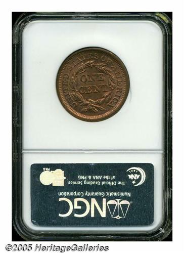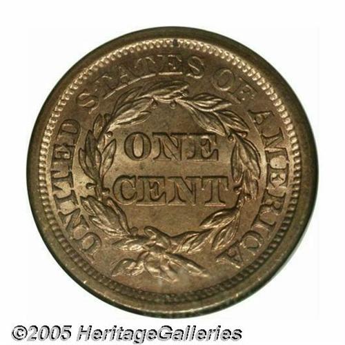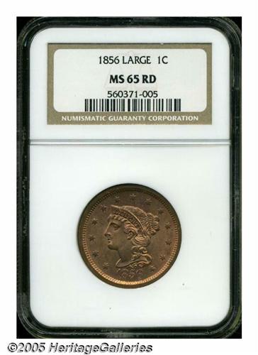 <B>1856<1C> Slanted 5 MS65 Red NGC.</B></I> N-14, R.1. A lovely full red example of this popular, late date Large cent. The centers are strongly struck with the usually seen softer details around the margins. Only the most minor marks and specks of carbon are seen with a magnifier on this exceptional type coin. Population: 14 in 65, 1 finer (4/05).