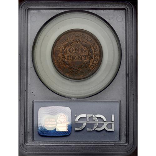 <B>1856<1C> Slanted 5 MS65 Red and Brown PCGS.</B></I> N-2, R.1. Die State d. A later die state with several fine die cracks on the obverse. A lovely example with fully lustrous bluish-brown surfaces and substantial mint red remaining on both sides. Finer than three of the five coins in the Brown sale and close to the Condition Census for this variety. EAC 63.<BR><I>From The Craig A. Stevens Registry Collection of Large Cents.</B></I> <BR><BR><B>Important notice:</B> Heritage usually auctions material at the rate of 200-250 lots per hour. On some occasions eBay Live bid software or the Internet may not be able to keep up with the pace of the auction. We recommend placing a realistic absentee bid now as insurance to avoid disappointment. Occasionally the auctioneer may eliminate or reject an eBay Live bid, and the auctioneer may also reopen a lot after the close of the eBay live bidding (usually because we missed an audience bid), and may reject your bid even if it shows you as the winning bidder. By bidding via eBay Live, you agree that Heritage may award the lot to another bidder at its sole discretion under the circumstances described above or any other reasonable circumstances. Since eBay bids are not shown to us until we open the lot on the floor, we treat those bids just like floor bids. In most cases the floor responds before the eBay bid is presented to us, due to Internet lag time, so for consistency we have made it a policy that floor bids are always considered first over tie eBay live bids. Also please note that all Heritage lots purchased through eBay Live carry a 20% Buyer's Premium. Please make sure you read the Terms and Conditions before you bid. This lot is being auctioned in conjunction with a live floor auction by Heritage Galleries & Auctioneers. All final auction and invoice information will be supplied by Heritage Galleries & Auctioneers, and all other information should be considered preliminary. Lot:345 <BR><BR><B>Winning Notification and Billing:</B> After the FINAL session in this auction is complete, Heritage will send e-mail and snail mail invoices. This process normally takes several days. All final auction and invoice information will be supplied by Heritage Galleries & Auctioneers, and all other information should be considered preliminary. <BR><BR>This auction will be conducted on a live auction floor and over the Internet through eBay Live. If you choose to place an absentee bid, please take a moment to <font color='#0000ff'><u><a href='http://pages.ebay.com/liveauctions/help/before/laabsentee.html'>learn how eBay Live absentee bidding works</a></u></font><font color='#000000'>