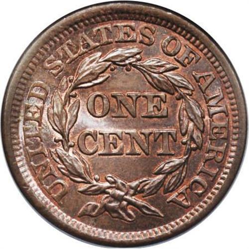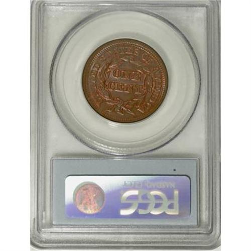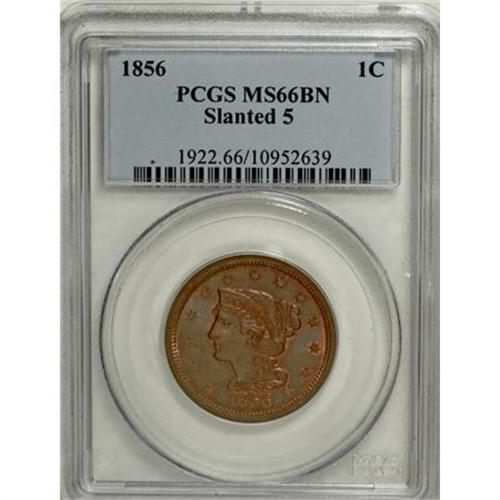 <B>1856 1C Slanted 5 MS66 Brown PCGS.</B></I> N-21, R.2. Although it is considered a common variety today, the N-21 die combination was not known to Newcomb before his reference was posthumously published. This example is well within the Census for the variety, probably ranking among the four finest known pieces. Incredible luster and gorgeous blue-brown color accompanies splashes of original frosty mint red. EAC 63. Population: 1 in 66, 0 finer (8/07).<BR><BR><B>Coin Engraver:</B> Christian Gobrecht<BR><BR><b>Shipping:</b> Coins & Currency (<a target="_blank" href="http://www.heritageauctions.com/common/shipping.php">view shipping information</a>)