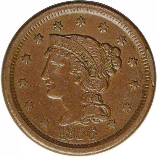 <B>1856<1C> Slanted 5. N-13, R.1. AU55 NGC. VF25 EAC.</B></I> Grellman state d. The obverse has a rim break over stars 10 and 11.Lightly abraded medium brown surfaces.<BR><I>Ex: Gordon Wrubel (8/25/1976).</B></I>